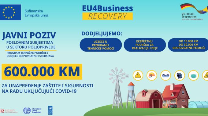U okviru projekta EU4BusinessRecovery, koji financiraju Europska unija i Savezna Republika Njemačka, danas je objavljen Javni poziv za učešće u programu tehničke podrške i dodjele bespovratnih sredstava u okviru mjere podrške investicijama u svrhu unapređenja zaštite i sigurnosti na radu (uključujući mjere zaštite od COVID-19) u sektoru poljoprivrede u Bosni i Hercegovini.