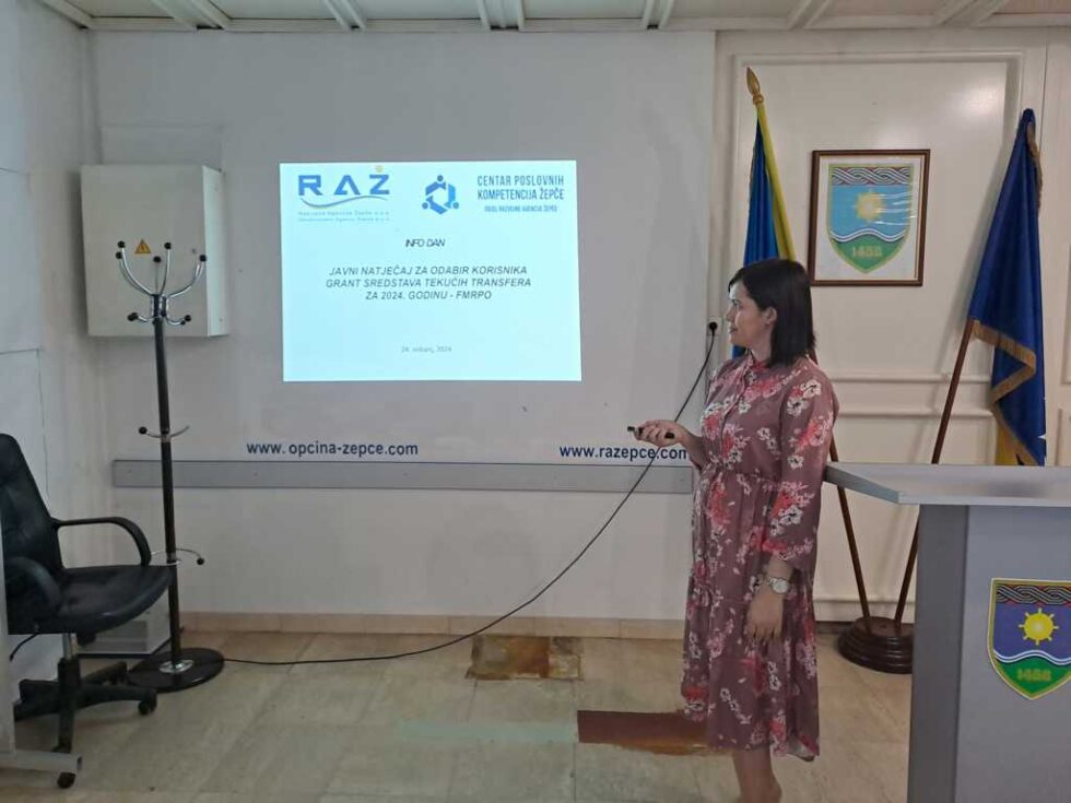 Razvojna agencija Žepče je u petak 24.05.2024. godine sa početkom u 14:00 sati u sali OV Žepče, održala Info dan o aktualnim javnim pozivima Federalnog ministarstva razvoja, poduzetništva i obrta i objavljenim javnim pozivima Ministarstva privrede ZDK. Putem prezentacije i predstavljanjem obrazaca za prijavu uposlenica Razvojne agencije Žepče Marijana Tomić (Sektor za poduzetništvo unutar Razvojne agencije Žepče) je upoznala potencijalne korisnike sa uvjetima i kriterijima Javnog poziva i iznosima koji im stoje na raspolaganju.