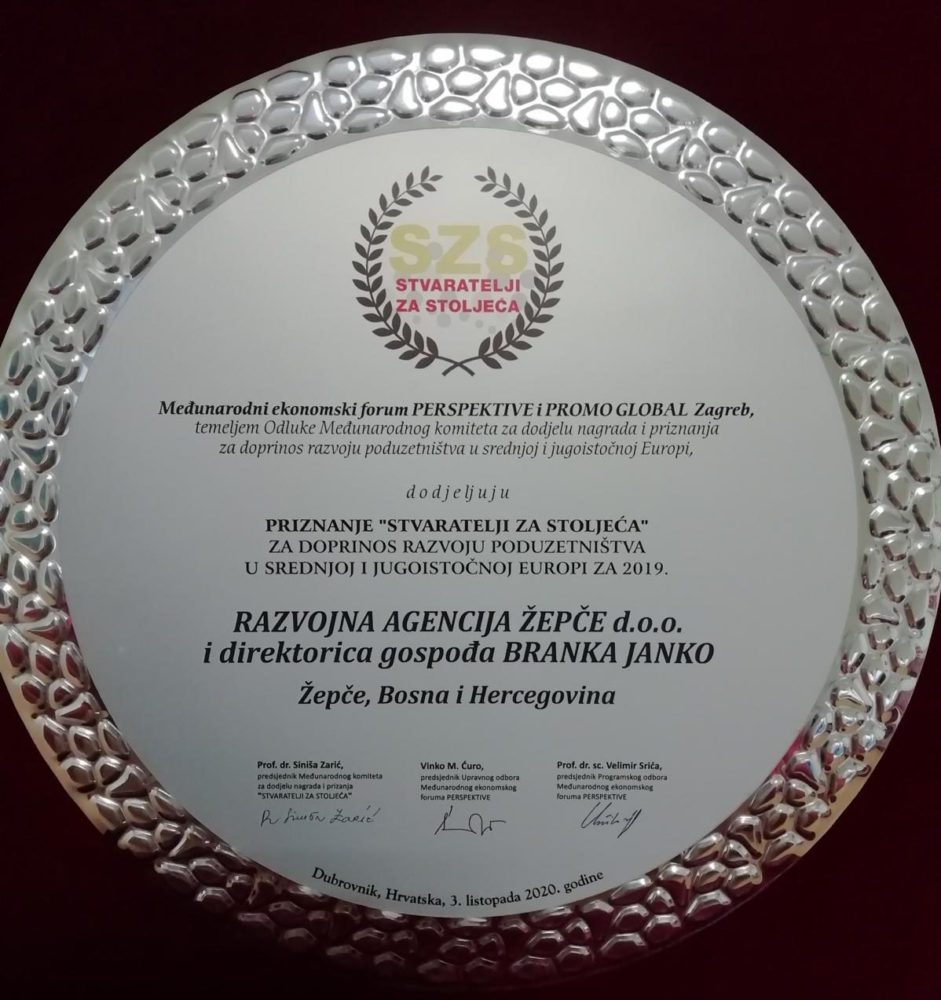 Razvojna agencija Žepče d.o.o je dobitnik priznanja „Stvaratelji za stoljeća“ za doprinos razvoju poduzetništva u srednjoj i jugoistočnoj Europi koje joj je ove godine dodijelio Međunarodni ekonomski forum na temelju odluke Međunarodnog komiteta za dodjelu nagrada i priznanja za doprinos razvoju poduzetništva u Srednjoj i Jugoistočnoj Europi.