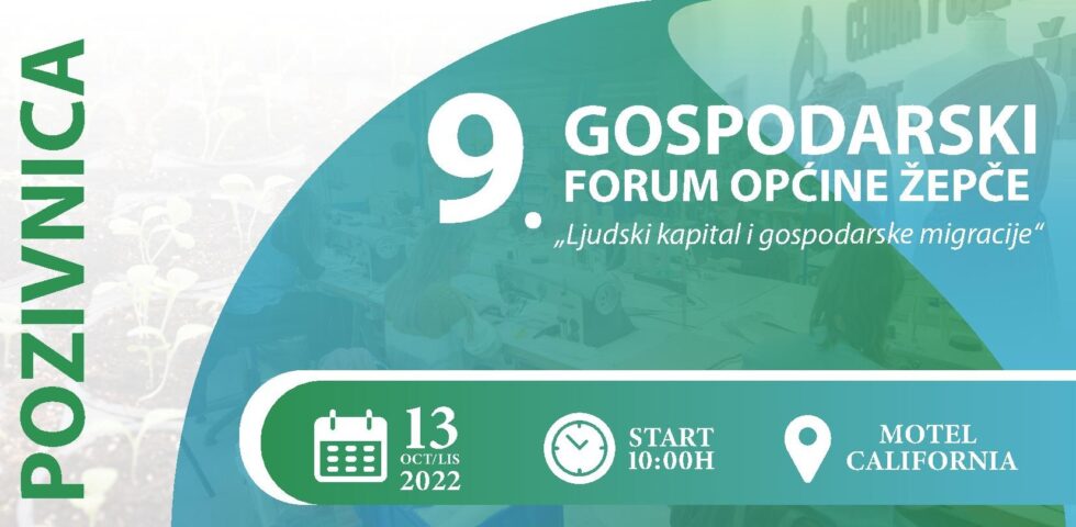 9. Gospodarski forum općine Žepče održat će se u četvrtak, 13.10.2022. godine u Žepču s početkom u 10 sati u restoranu California Brankovići Žepče, i posvećen je problematici koja je vezana za tržište radne snage, a cilj je aktualizirati problematiku koja se odnosi na zadržavanje i nedostatak radne snage u BiH s fokusom na tzv. „uvoz radne snage iz inozemstva“.