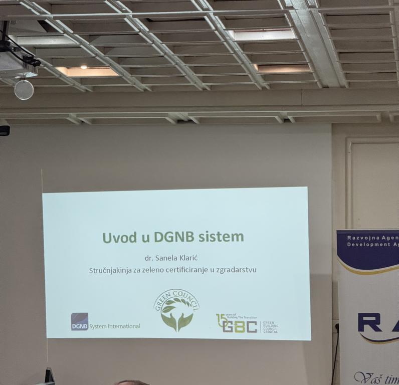 Predavačica je bila Sanela Klarić, stručnjakinja za održivu arhitekturu i ruralni razvoj, te jedna od vodećih zagovornica zelene gradnje u Bosni i Hercegovini. Klarić je predstavila principe DGNB certifikacije, jednog od najnaprednijih svjetskih standarda za ocjenjivanje održivosti zgrada i urbanih cjelina, te naglasila kako ovaj certifikat donosi brojne koristi poslovnom sektoru – od jačanja korporativnog imidža i ispunjavanja ESG kriterija, do dugoročnih financijskih ušteda, olakšanog pristupa zelenim fondovima i povećanja tržišne vrijednosti nekretnina. Posebno je istaknula potencijal Bosne i Hercegovine u razvoju održive gradnje kroz korištenje prirodnih materijala, što je ujedno i centralna tema njenog akademskog i istraživačkog rada.