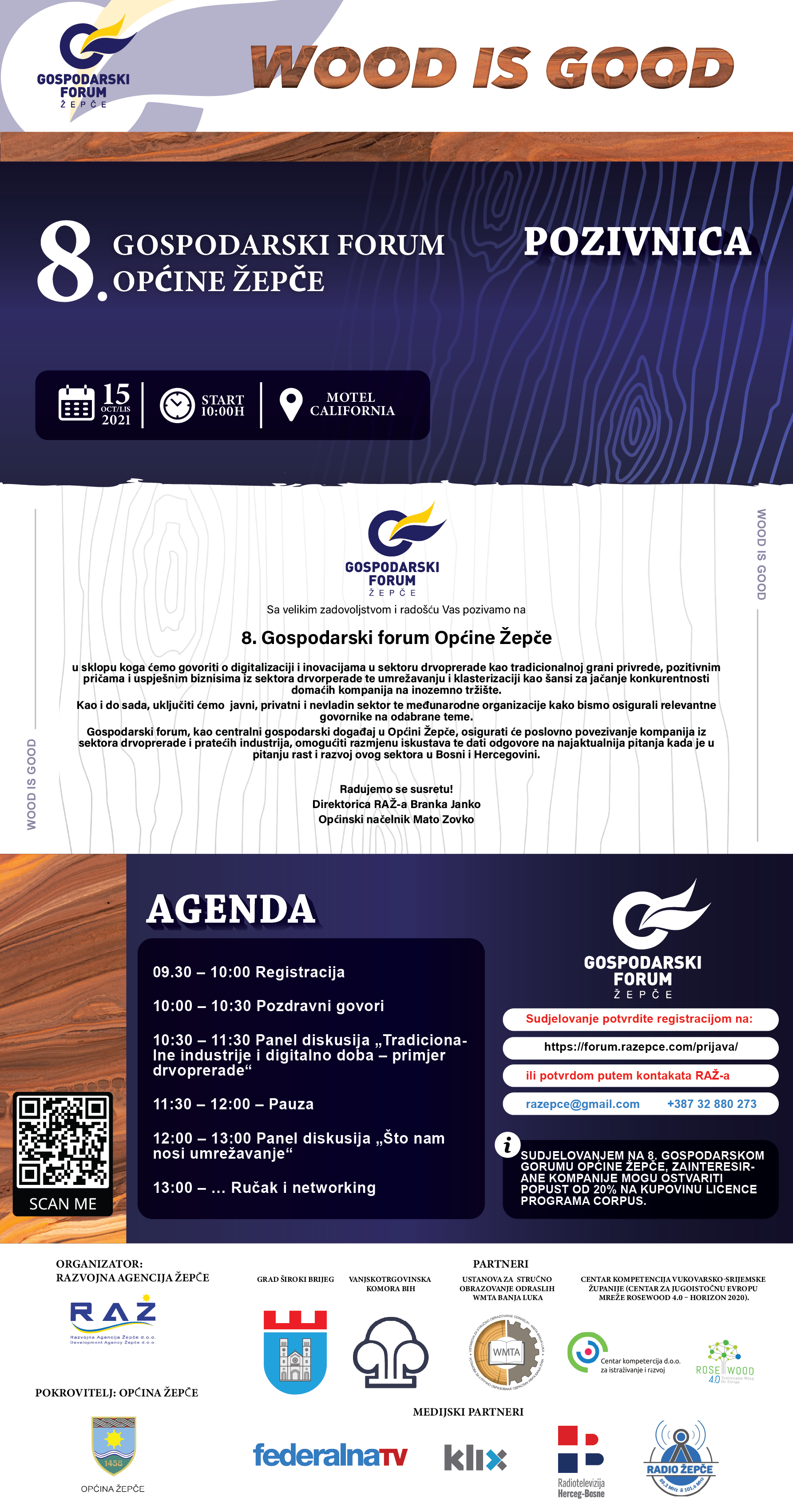 Razvojna agencija Žepče organizator je 8. Gospodarskog foruma općine Žepče koji u fokusu ima inovativnost u drvoprerađivačkom sektoru u Bosni i Hercegovini, kroz zajednički slogan „WOOD IS GOOD“, a održat će se 15.listopada/oktobra 2021. god u općini Žepče.