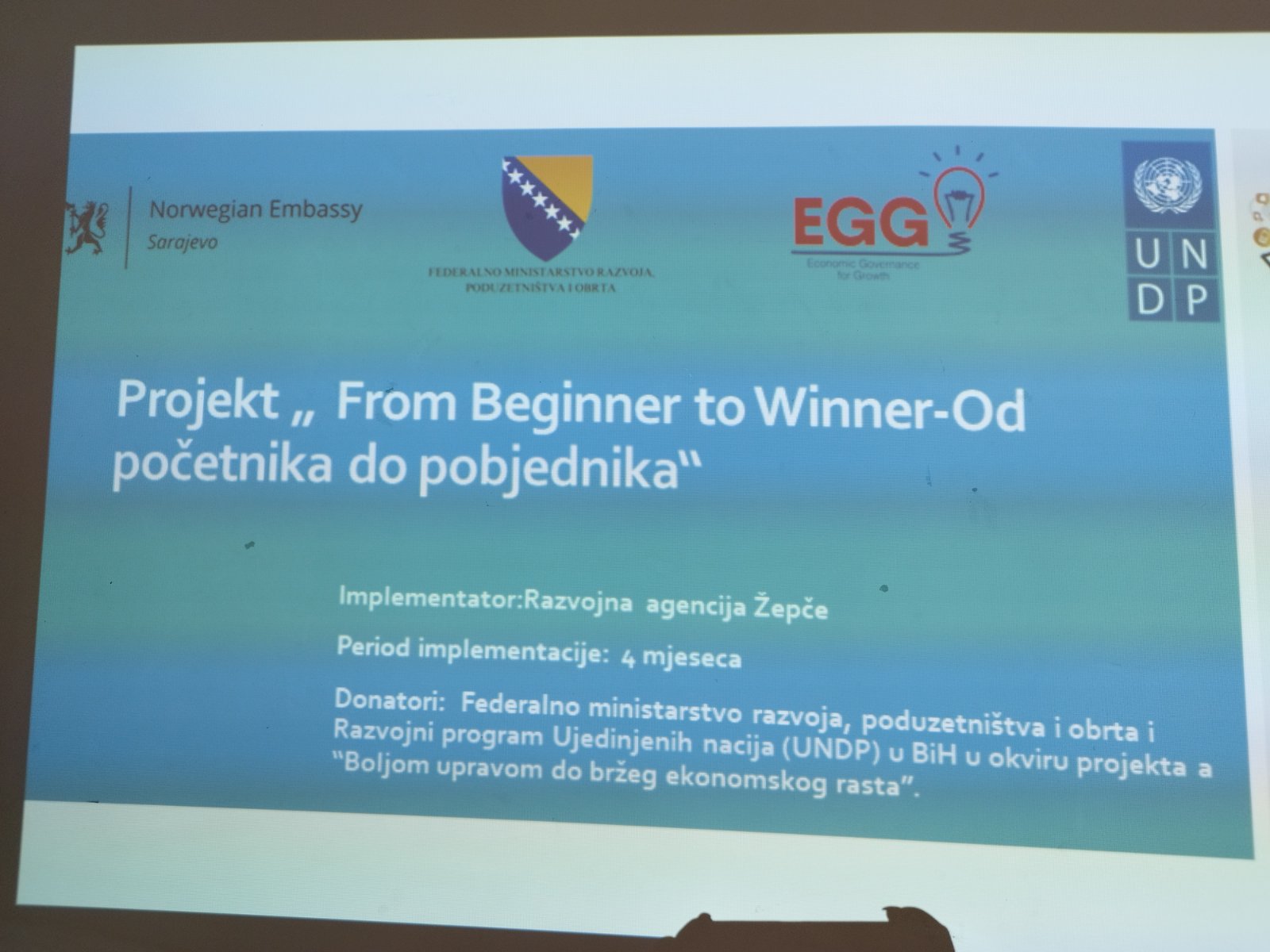 U petak, 26.4.2024. godine održana je prezentacija projekta i nove usluge za poduzetnike e-poslovni asistent koja je uspostavljena u sklopu projekta „From beginner to winner“ – Od početnika do pobjednika koji je podržan kroz zajedničku Grant shemu koju implementiraju Federalno ministarstvo razvoja, poduzetništva i obrta i Razvojni program Ujedinjenih nacija (UNDP) u BiH u okviru projekta „Boljom upravom do bržeg ekonomskog rasta“ (EGG2), kojeg financira Vlada Kraljevine Norveške.